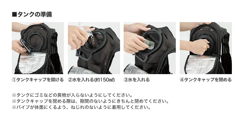 - 凍ったペットボトルや氷を背中のタンクに補充してしっかり蓋を閉める