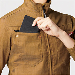 胸元や内ポケットに大きなポケットがあるので作業道具やメモ帳など、収納にも困らないジャケットです。